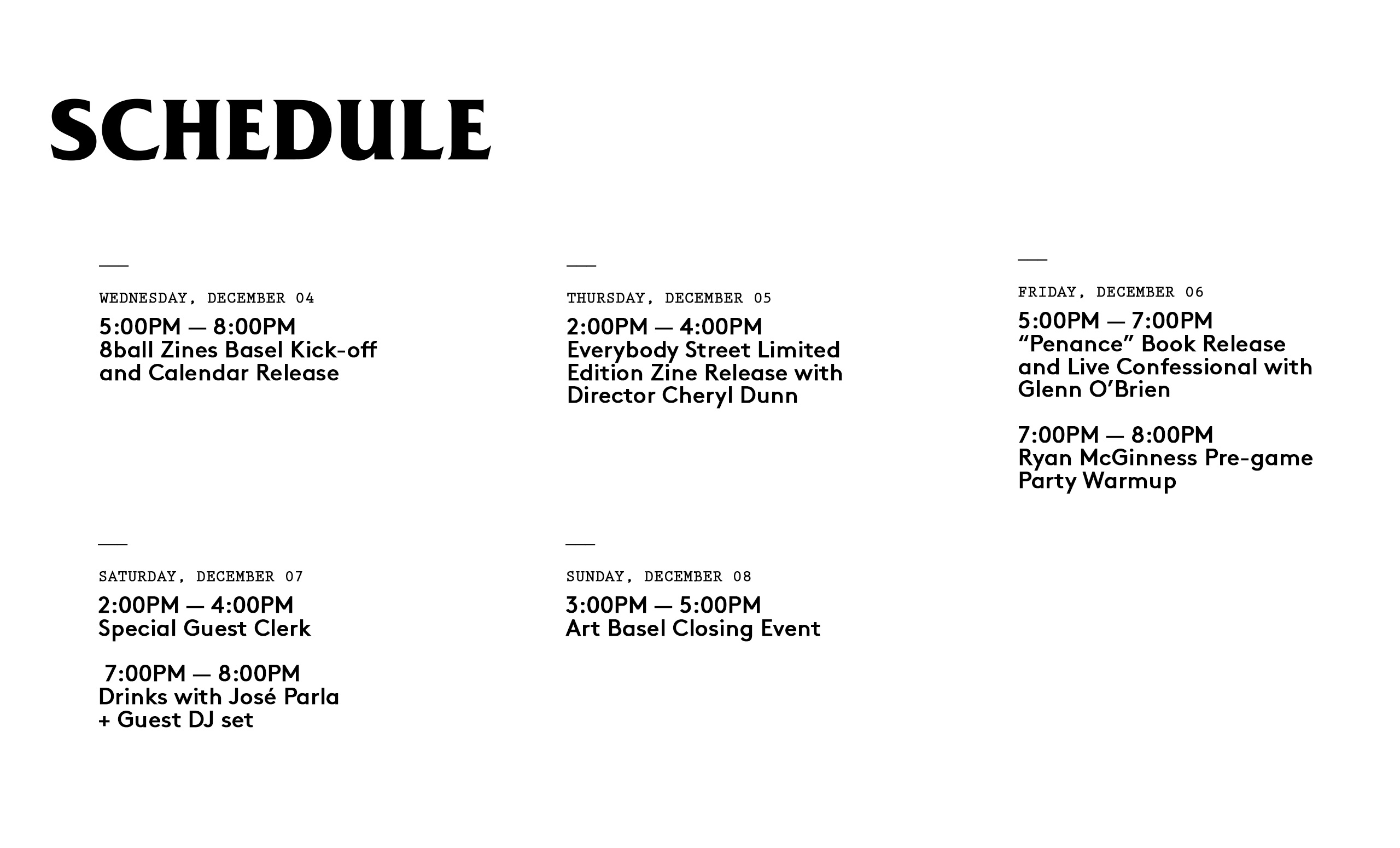 For Art Basel, a selection of publications have been curated alongside zine collections of Johan Kugelberg (Boo-Hooray, New York, NY), Owen O'Leary (New York, NY), and Matt Wobensmith (Goteblüd, San Francisco, CA).